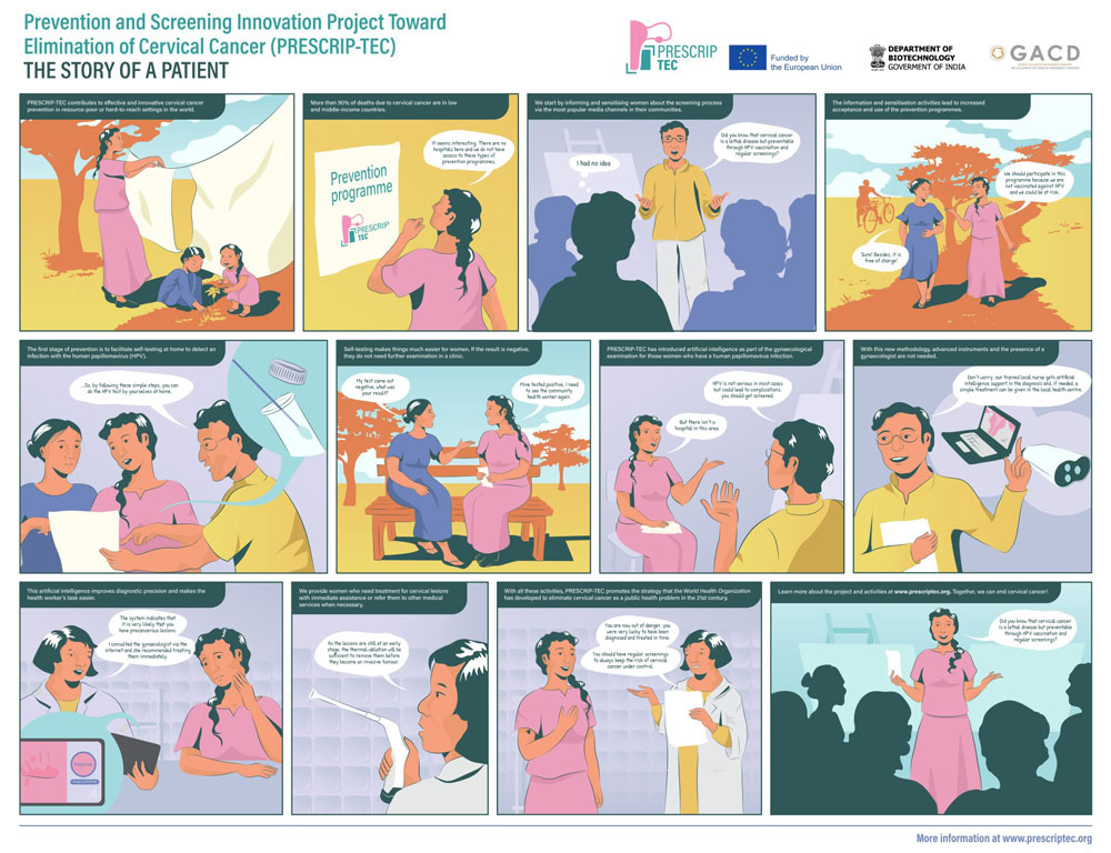 The poster, in the format of a comic and through the story of a patient, explains the real impact of the project in low-resource or hard-to-reach communities where it is not possible to implement Western cervical cancer prevention protocols.
